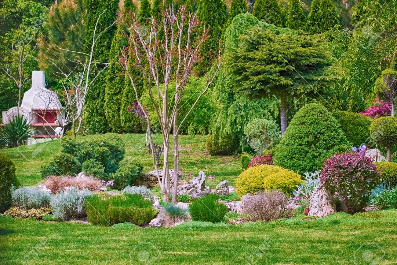 Summer Landscape Of The Garden With Different Kinds Of Plants